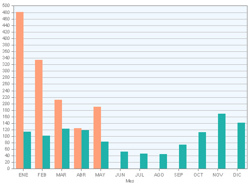 Maiatzean izan diren etengabeko euriteen ondorioz 189 litro/m2 inguru pilatu dira Ultzamako bailaran (Oskozko estazioko datuak), maiatzean ohi denaren bikoitza baino gehiago. Baina, ur honi gehitu behar dizkiogu urte hasieratik egin dituen euri ugariak ere. Urte honetan 1.340 litro euri egin du jadanik, lehen seihilekoan urte batean egiten duena baino euri gehiago egin du. Ikus grafikoa.